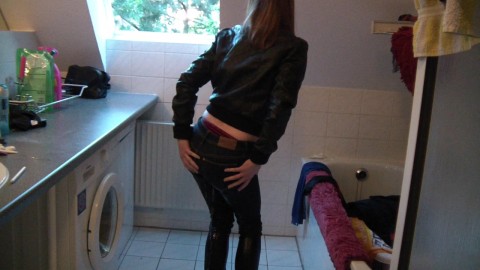Ich steh in kurzer Lederjacke, enger Jeans und Gummistiefeln im Badezimmer und piss mich ordentlich ein…